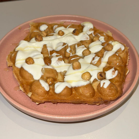 frische Bubble Waffel, Puderzucker, Joghurt, Honig, Nüsse, Vanilleeis (saisonal) / Vanillesoße, Schlagsahne
